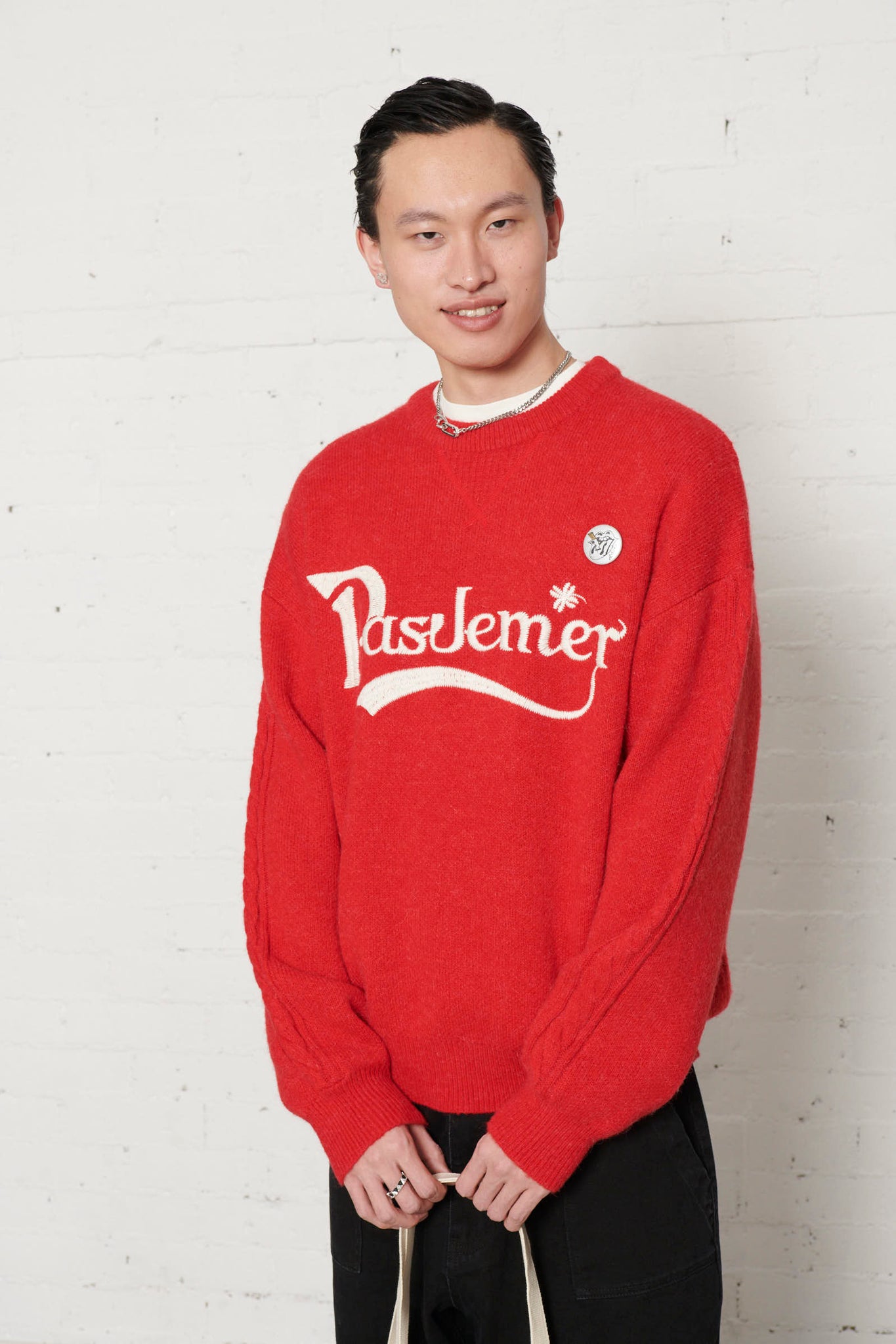 Features jacquard knit with a bold Pas De Mer logo across the front and cable detailing on the sleeves for added texture and character.