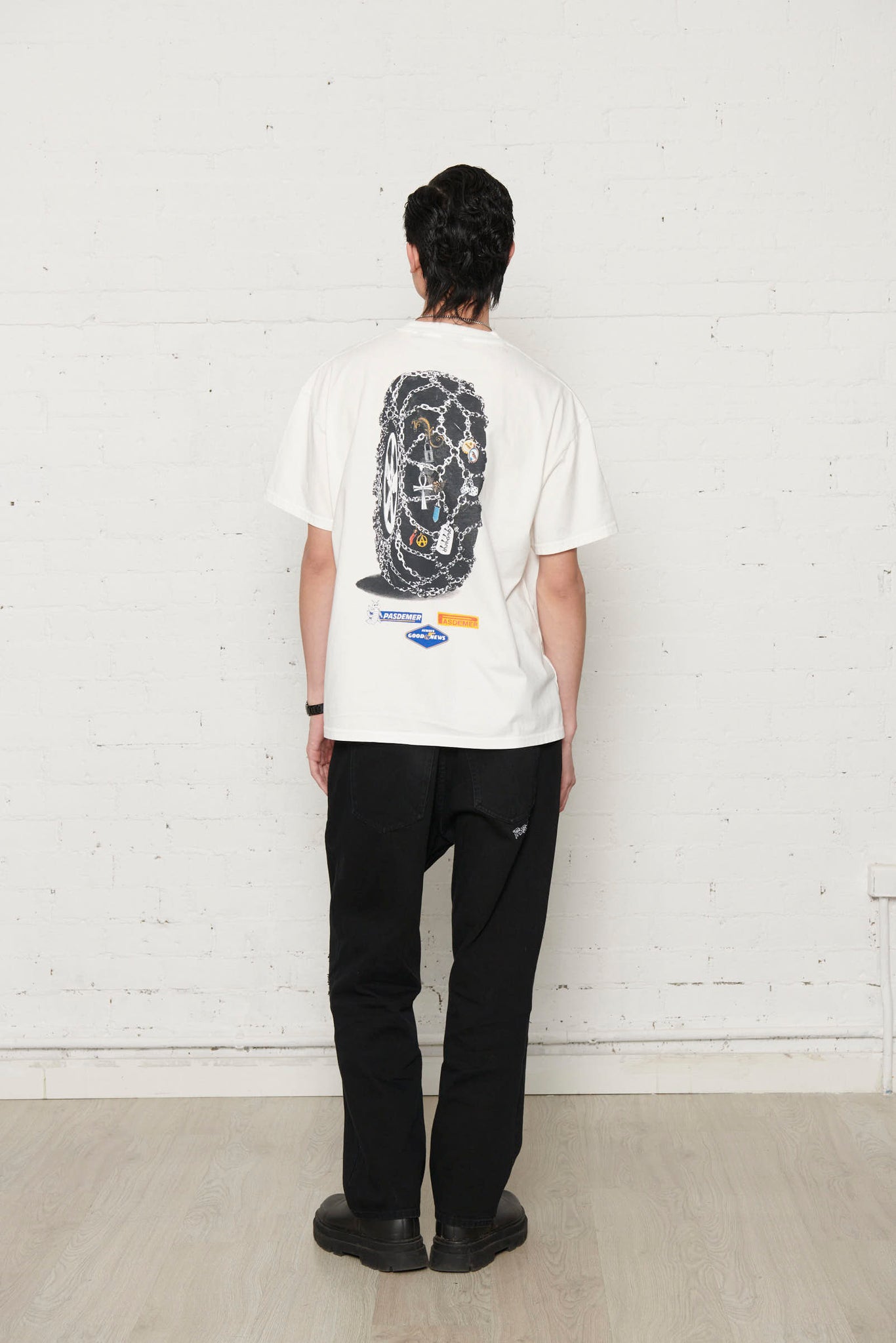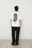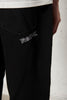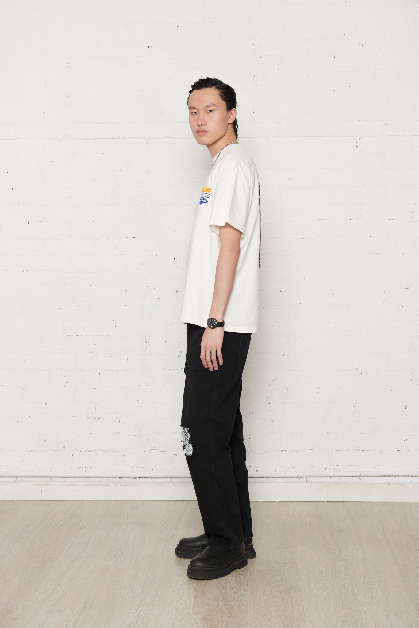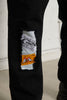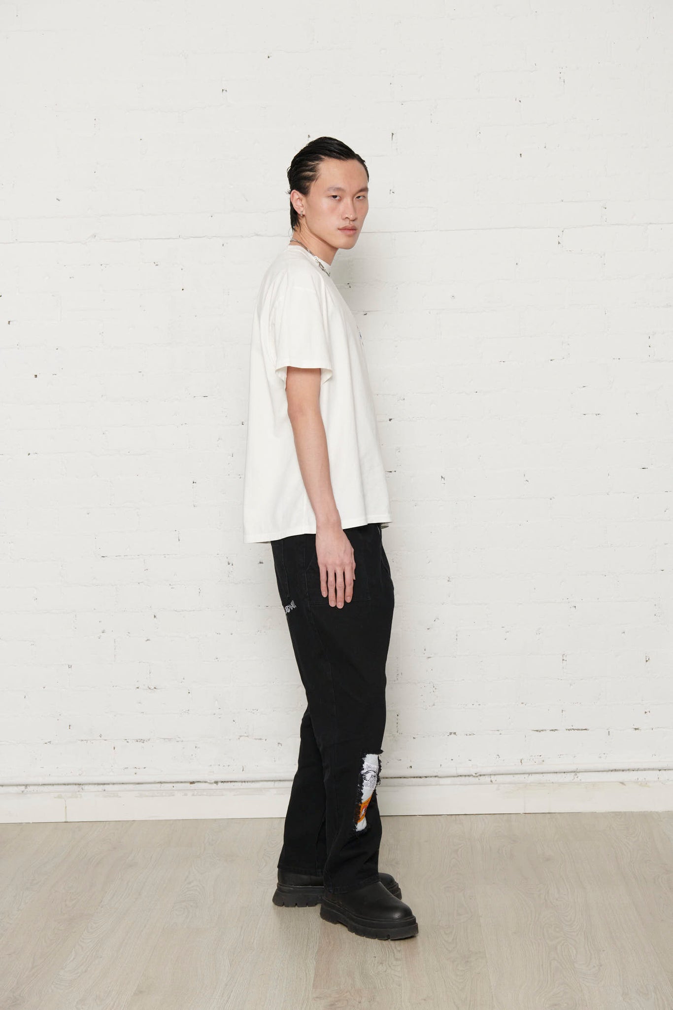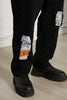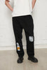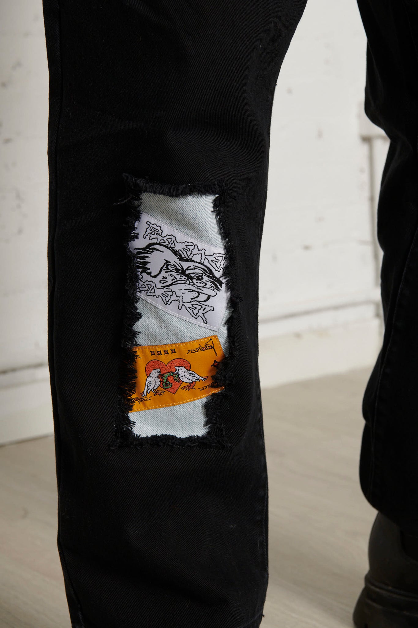 Designed in a dark blue wash, the pants are detailed with raw-edge patches on the front legs, featuring woven graphic labels and embroidered artwork for a distinctive finish.