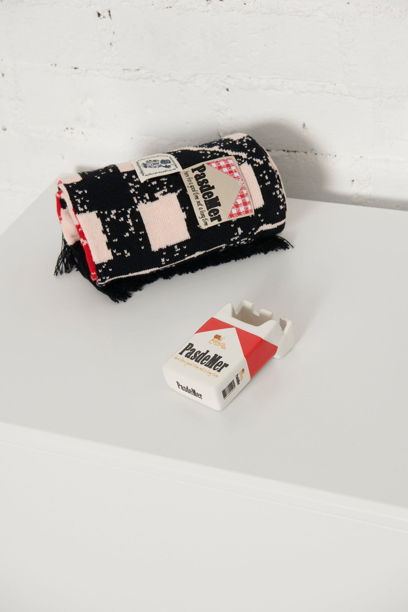 Designed in a playful cigarette-pack silhouette, it features an all-over red and white print with “Pas de Mer” branding and slogan detailing.